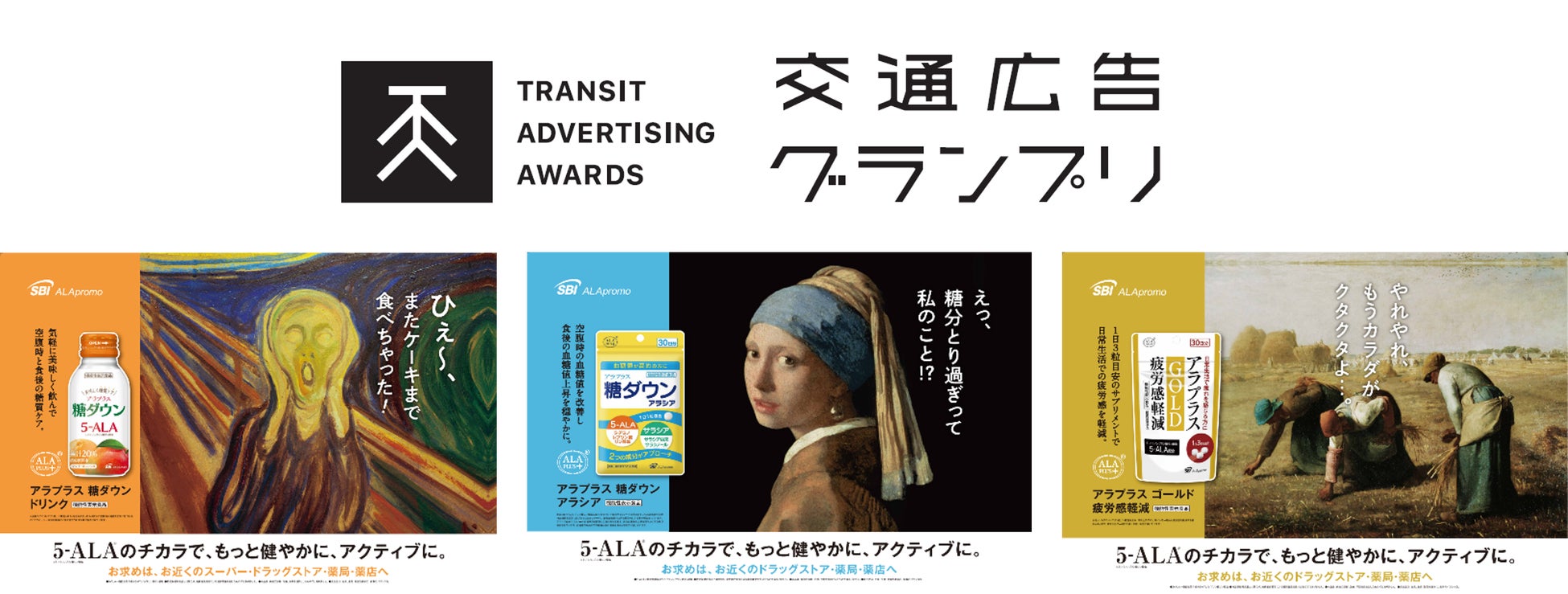 2022年10月に機能性表示食品「アラプラス 糖ダウン ドリンク」「アラプラス 糖ダウン アラシア」「アラプラス ゴールド 疲労感軽減」の3商品にて実施した、世界の有名絵画をモチーフにした交通広告(JR東日本 ドア横ポスター)は、各商品と名画のそれぞれの特長を融合させることで、ひと目で好奇心を描き立て心に残る広告となったことが評価され受賞に至ったと考えられます。