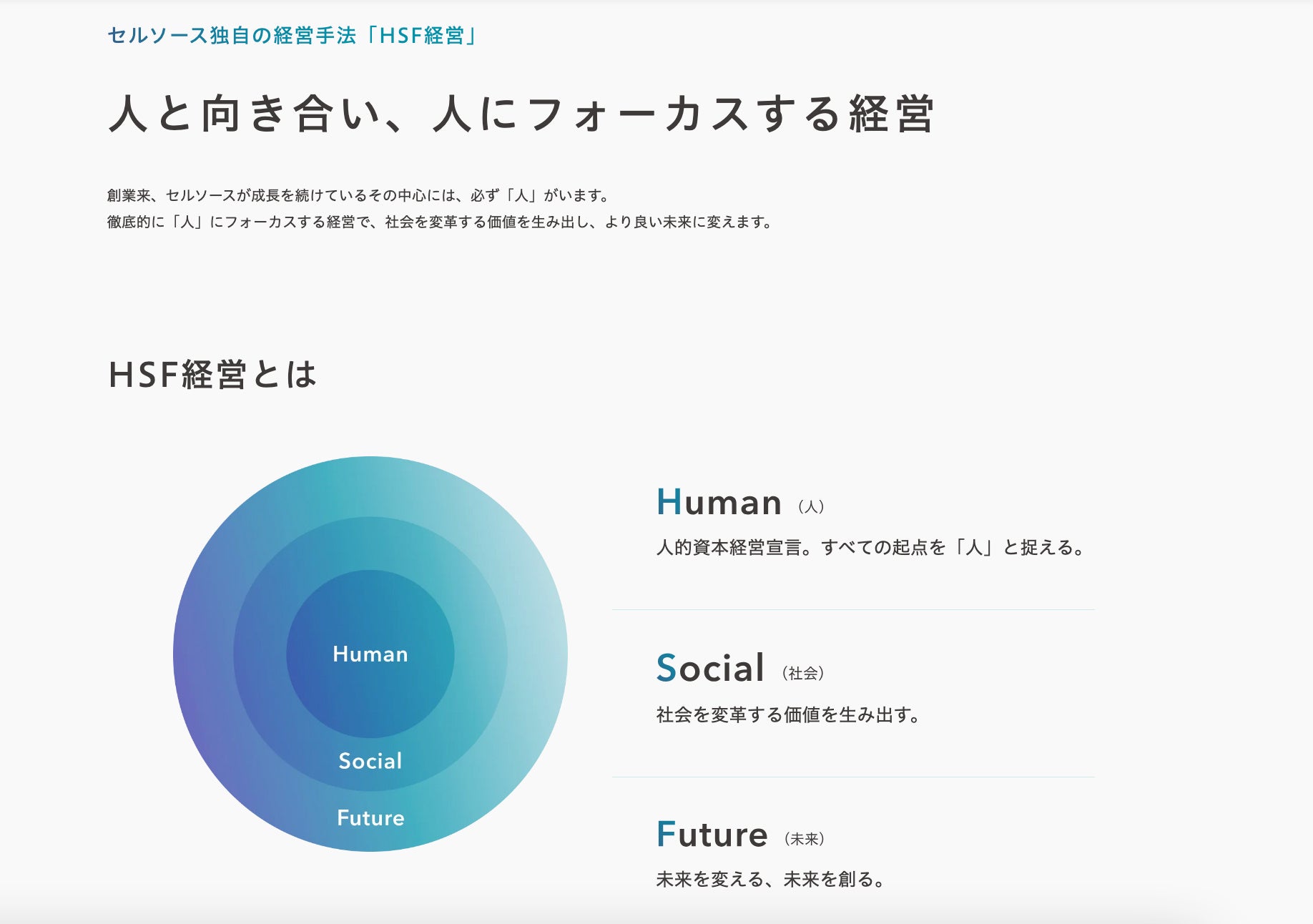 当社は「Human/Social/Future」の頭文字を取った「HSF経営」という独自の経営手法を取っています。今回の採用サイトにて、HSF経営とは何か、当社のPurpose/Mission/Values、そして当社の行動規範である「セルソース思考22」とどう連動しているのか、について表現をしています。