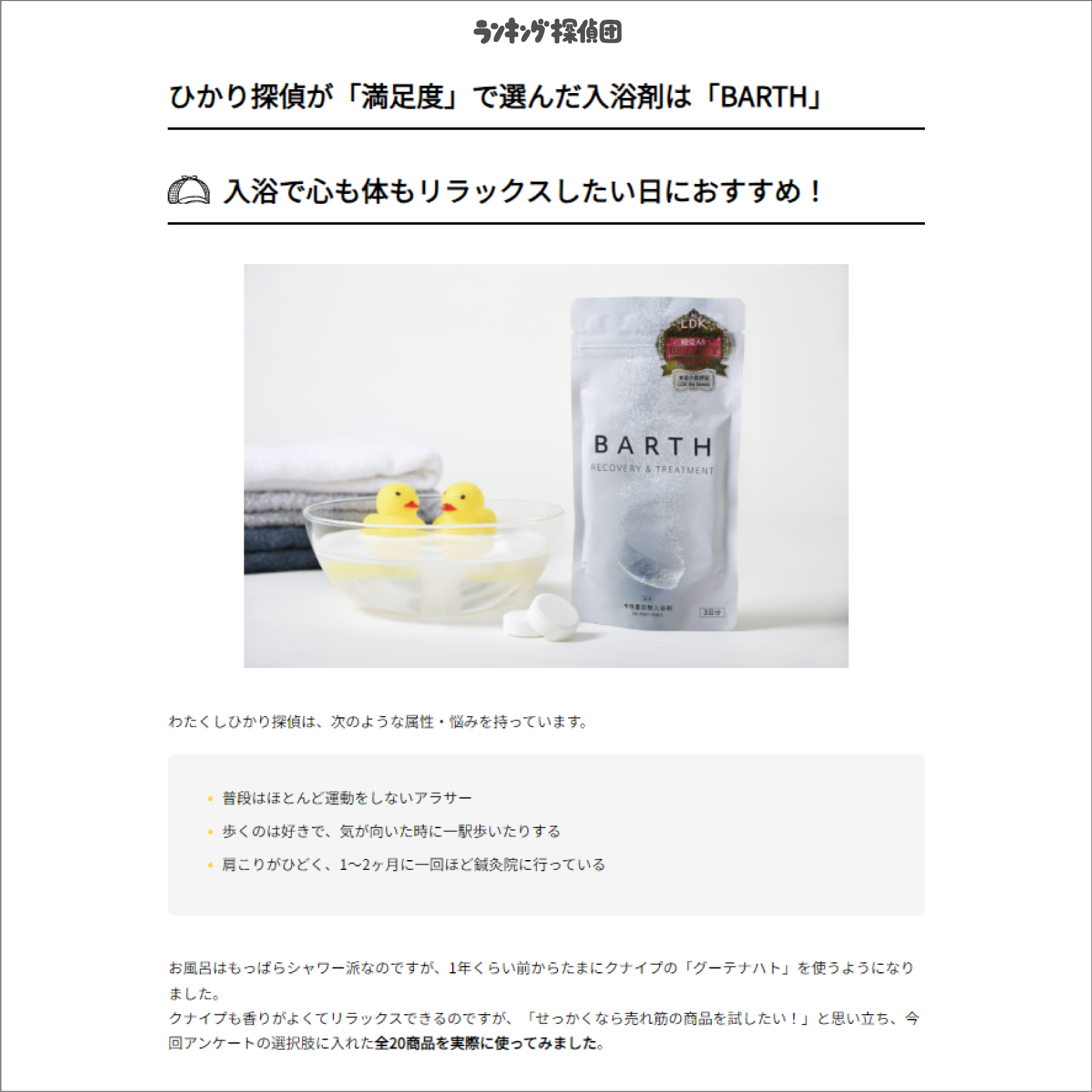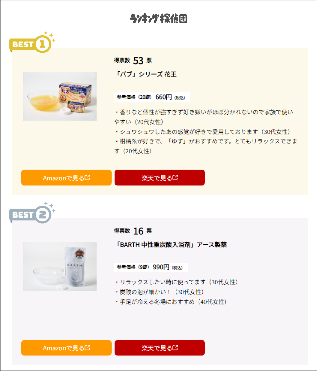 また、ランキング探偵団の編集者2名がランクインした入浴剤を実際に使用し、それぞれ「満足度」「香り」のテーマでおすすめの商品をピックアップ。