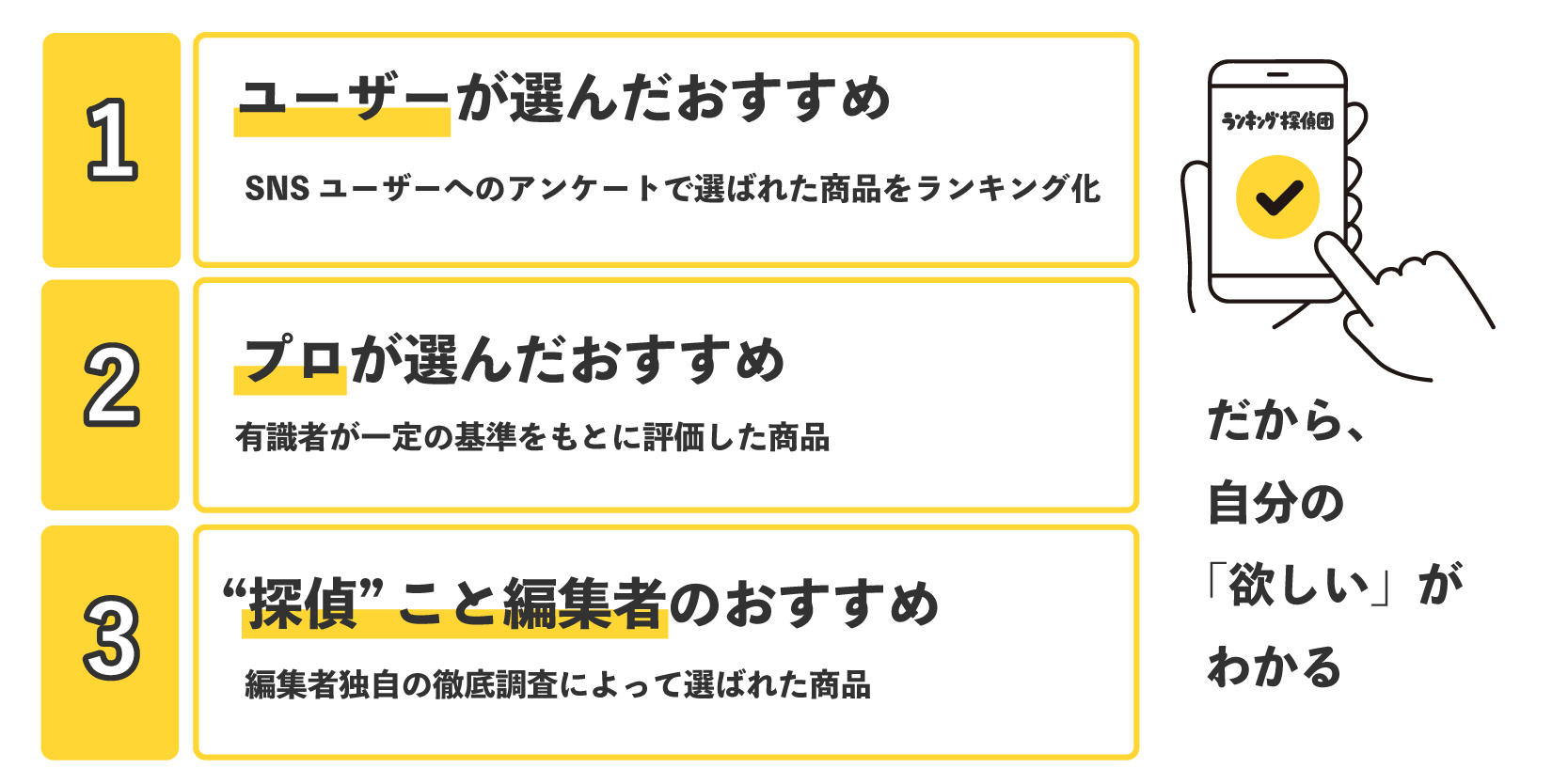 ネット上にある膨大な数の商品から自分に合ったモノやサービスが選べるよう、一般ユーザーのアンケートや有識者の見解、編集者の徹底調査の3つの視点で「おすすめ」の商品をご紹介します。