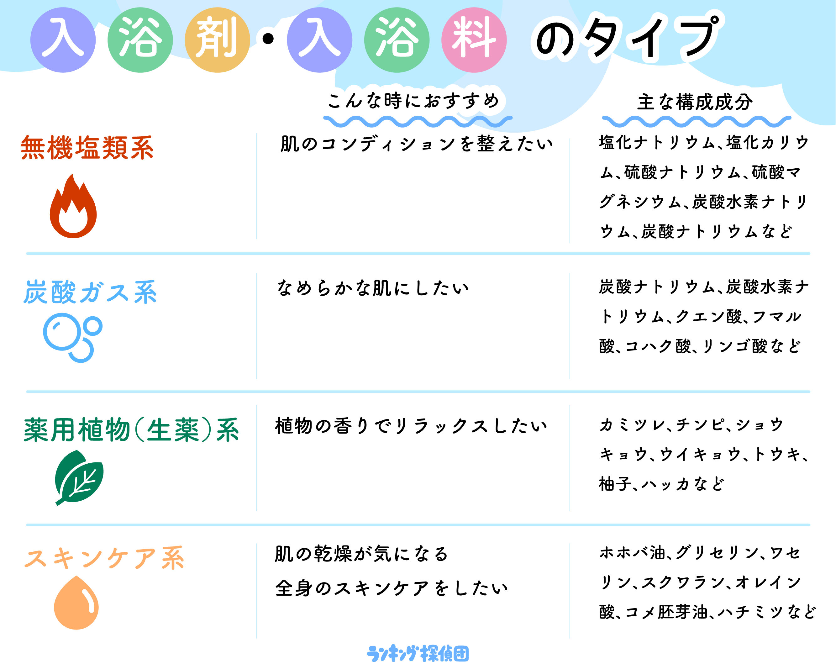 本記事では入浴剤に含まれる代表的な成分を4種類に分け、気分に合わせて選べる「入浴剤・入浴料のタイプ一覧表」を作成しました。