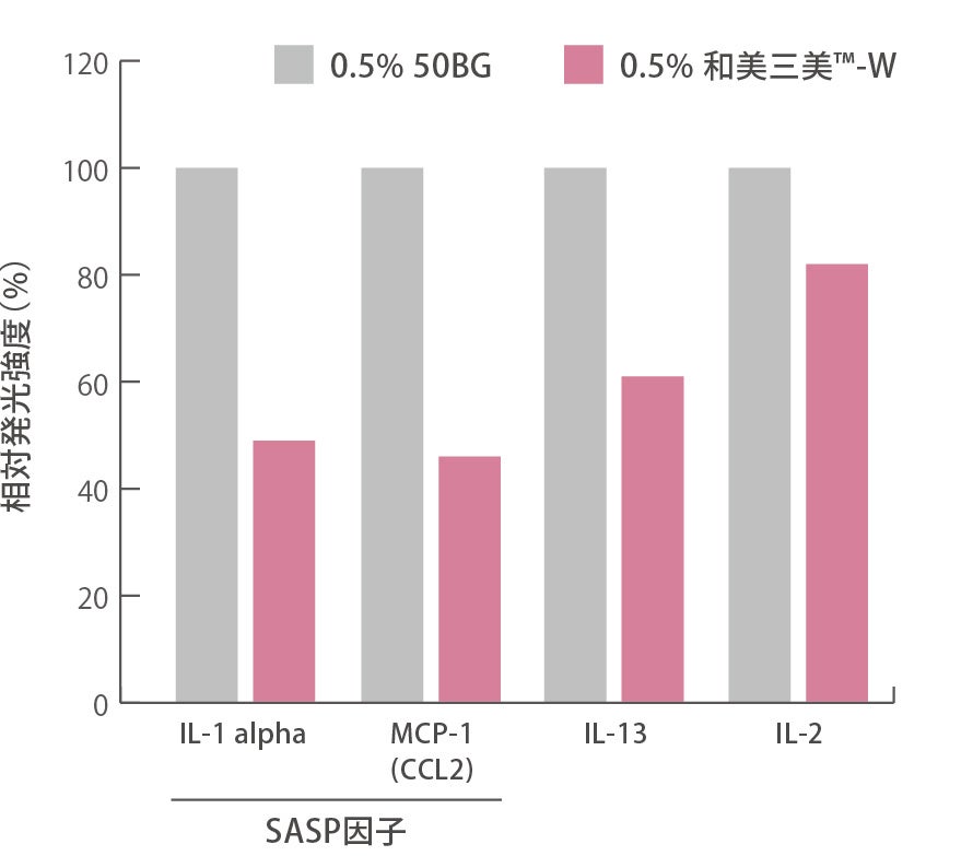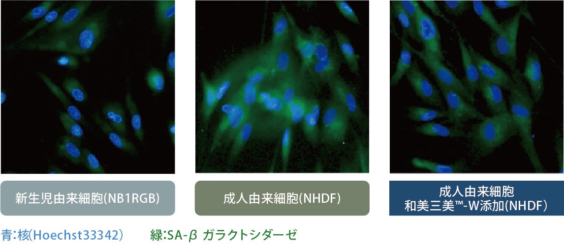弊社ライフサイエンス総合研究所における、機能性研究結果では、老化細胞モデルであるヒト成人由来線維芽細胞におけるSASP因子(IL-1alpha、MCP-1、IL-13 、IL-2)の分泌が和美三美™-Wによって、抑制されていることが確認されました(図3)。さらに、細胞の老化指標であるSA-βガラクトシダーゼ活性の観察によって、和美三美™-Wが細胞の老化状態を改善している様子も観察することができました(図4)。