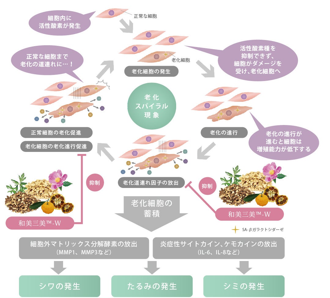 これまで、肌の老化は加齢とともに段階的に進行するイメージがあり、さらにその主たる要因として紫外線を浴びることによる光老化への対応が注目されてきました。今回弊社が注目した老化道連れ因子™と老化スパイラルは、紫外線を浴びずとも、1つの老化細胞の存在が、周りの正常細胞の老化を助長する、老化の加速メカニズムであること。そして、老化がさらに周囲の老化を呼び込む負のスパイラルを起こす自然老化の1つであり、新たに対応すべき肌老化の原因であると考えています。今回和美三美™-Wの提供を通して、「老化スパイラルを引き起こす自然老化を防いで、さらに若々しい肌を引き出す」という、抗老化への新たなアプローチ方法として提案して参ります。
