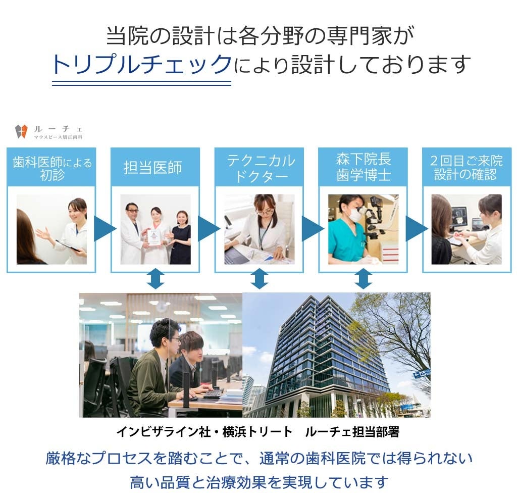ルーチェでは厳格なチェックプロセスを導入しています。このような3ステップの厳格なプロセスを踏むことで、通常の歯科医院では得られない高い品質と治療効果を実現しています。