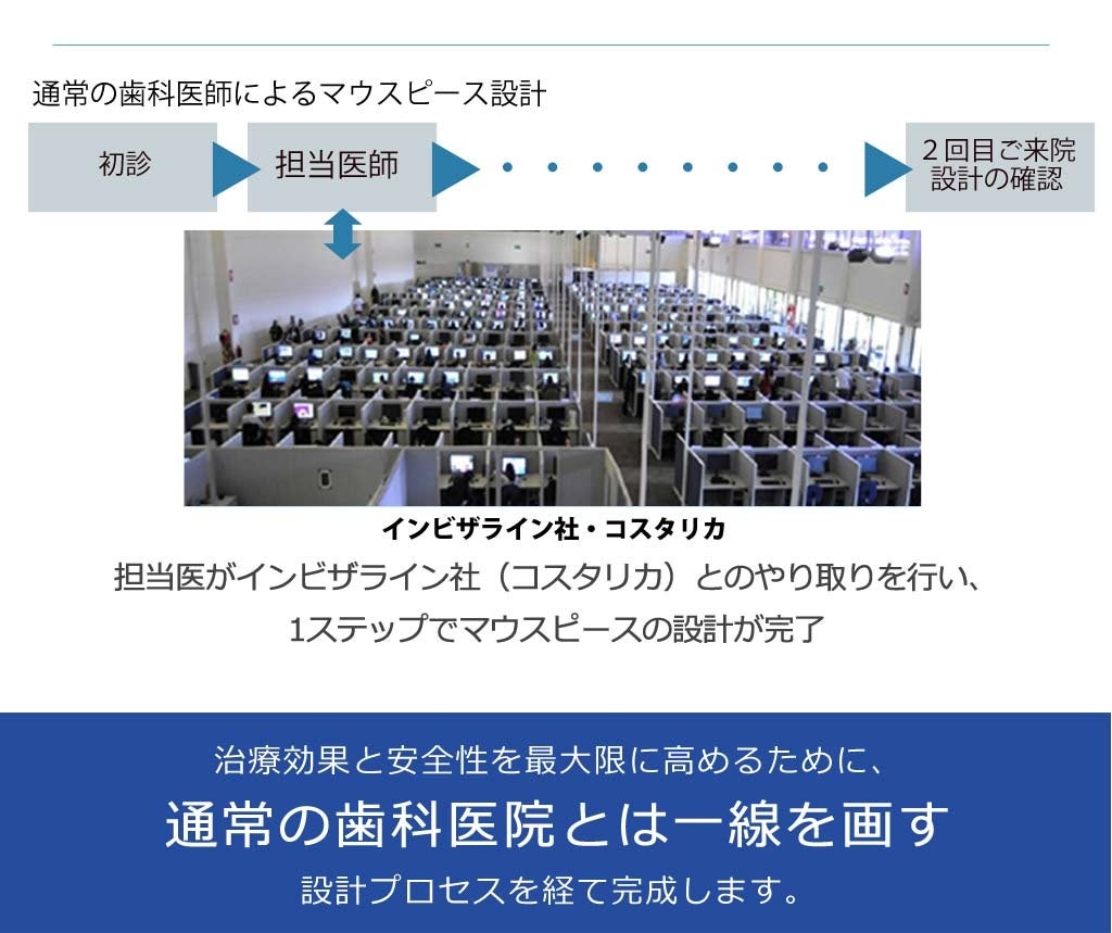 通常の歯科医院では、設計のために担当医がインビザライン社(コスタリカ)とのやり取りを行い、1ステップでマウスピースの設計が完了します。