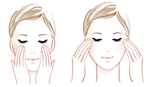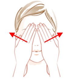 ●手のひら全体で目もと全体を引き上げるようにしながら、うるおいをグッと押し込みます。