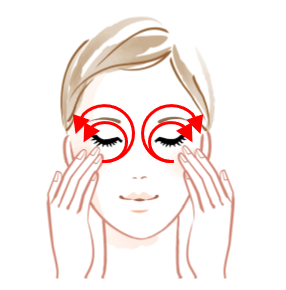 ●指の腹で小回りで目周り、大回りで眉間からこめかみまで、目周り全体に円を描くように広くなじませます。