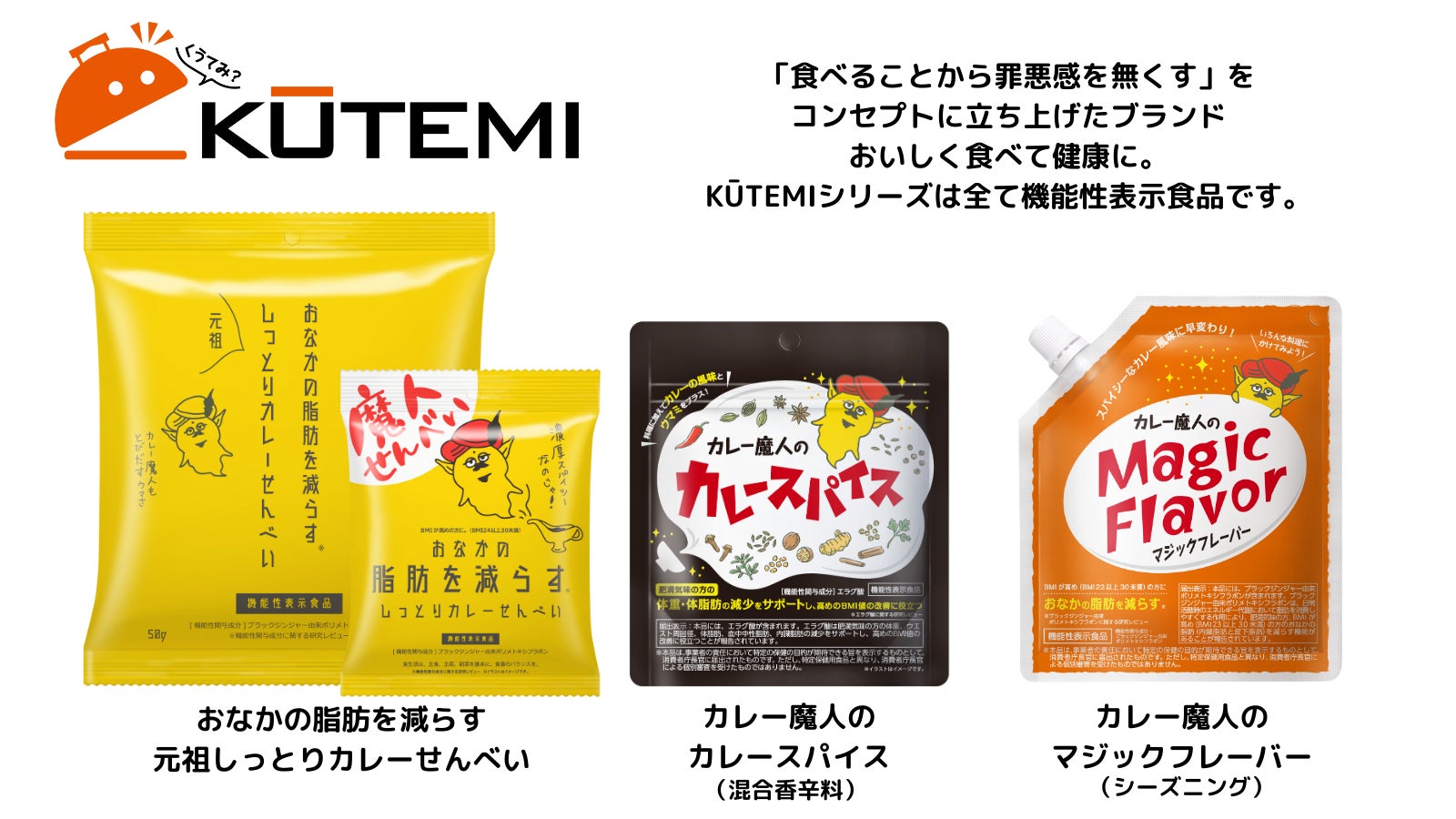 第1弾は、「おなかの脂肪を減らす元祖しっとりカレーせんべい」、第2弾は、料理に加えて体脂肪・体重・ウエストサイズ減少をサポートする(※2)「カレー魔人のカレースパイス」そして、第3弾は、お料理をしない方も、罪悪感のある食事にふりかけるだけの、おなかの脂肪を減らす(※3)「カレー魔人のマジックフレーバー」を販売しています。