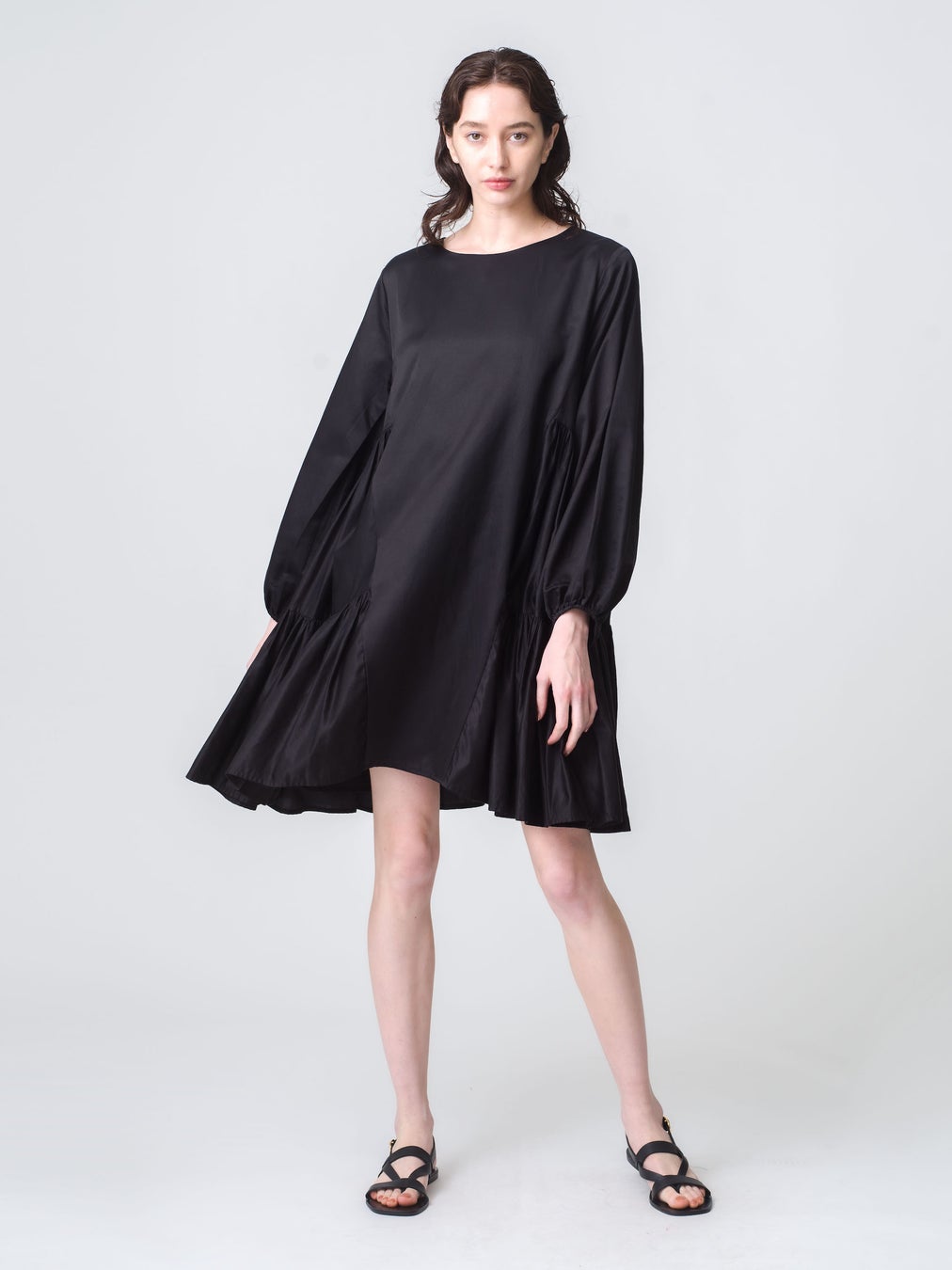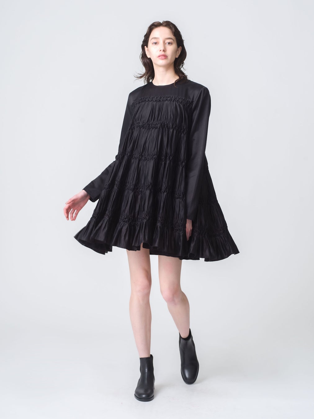 ゆるやなかパフスリーブと裾に広がるサイドのティアードで、立体的なシルエットに仕上げています。