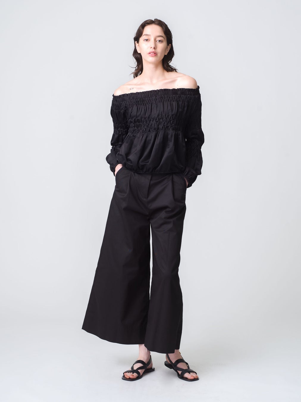 Merletteのシグネチャーであるダイアモンド柄のハンドスモッキング刺繍をあしらったエレガントなイブニングブラウス「アボット」。オフショルダーとボリューミーな袖がポイント。上質で軽量なコットンシルク素材を使用し、優美な存在感を放つコーディネートの主役になるアイテムです。
