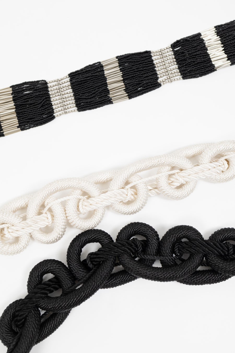 光沢のあるビスコースをマクラメ編みで、ループ状にしたベルト「ウプサラ」。アイボリー、ダークレッド、ブラックの3色展開です。