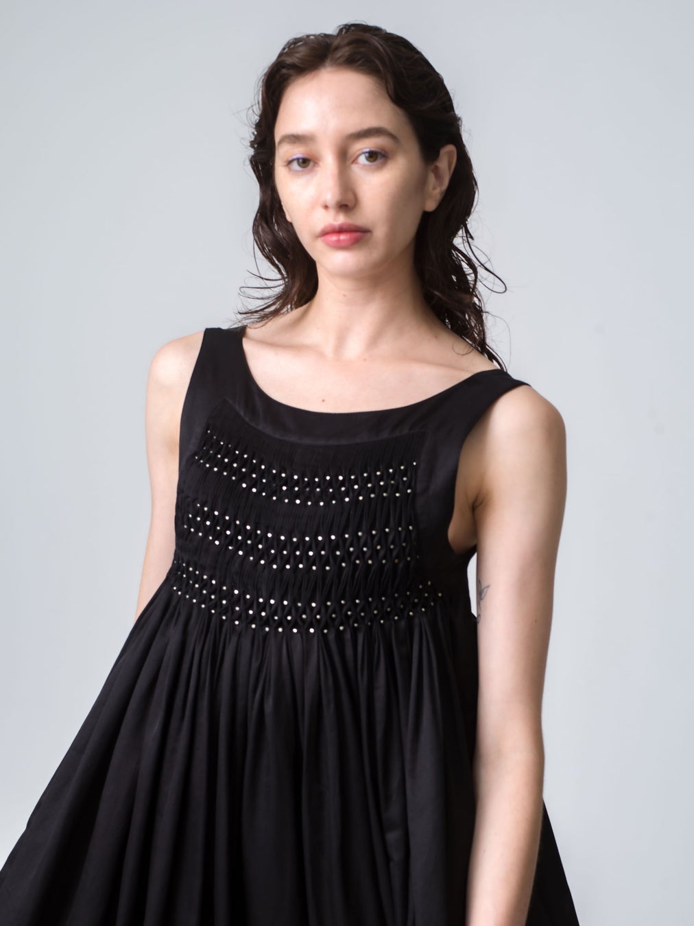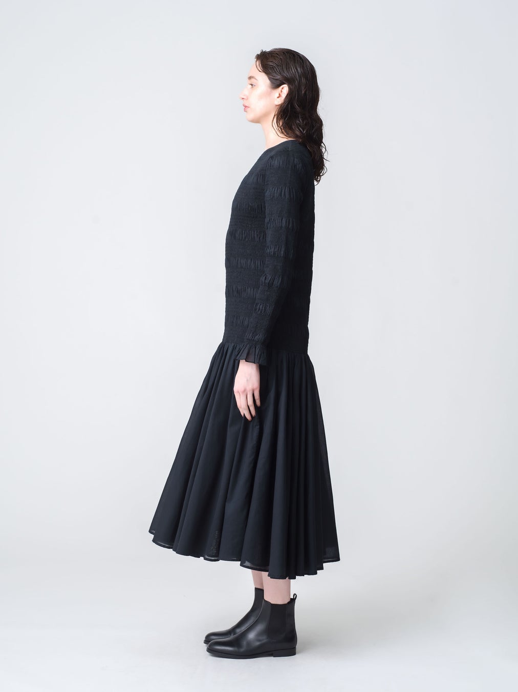 身体にフィットするボディーとふわっと広がるギャザースカートがエレガントなシルエットのドレス「シデン」。身頃全体に施されたスモッキングは伸縮性があり、快適で着心地の良いデザインです。軽量で滑らかなコットンシルク素材を使用しています。