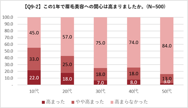 更に、この1年で眉毛美容への関心が高まったかの質問について、「高まった」(11.6%)あるいは「やや高まった」(21.4%)と答えた人を合計すると、約3人に1人が、眉への関心の高まりを感じていることがわかります。