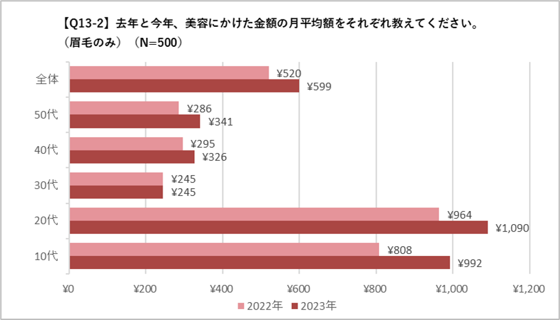 しかし一方で「眉毛ケアのみへの投資金額」については、ほぼ全世代で昨年よりも増額となり、全体では約15%アップという結果に。投資金額が最も高いのが20代(1,090円)、次いで10代(992)円となっており、特に若い世代が眉毛への投資を行っていることがわかります。