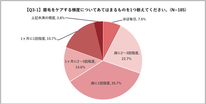 また眉毛をケアする頻度について質問したところ、最も多かったのは「週に1回程度」(35.7%)、次いで「週に2~3回」(22.7%)、「1ヶ月に2~3回程度」(14.6%)、また「ほぼ毎日」と答えた方が7.6%という結果となり、全体の66%の方が週に最低1回以上は眉のケアをしていることがわかりました。
