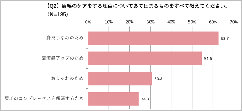 続いて眉毛のケアをする理由について質問したところ、最も多い回答は「身だしなみのため」(62.7%)、次いで「清潔感アップのため」(54.6%)で、過半数の方が身なりを整えるためにケアを行っていることがわかりました。