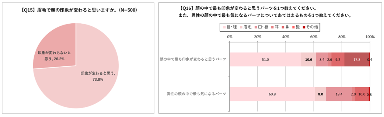 眉毛で顔の印象が変わるかどうかの質問に対しては、73.8%の人が変わると思うと回答。さらに「顔の中で顔の中で最も印象が変わると思うパーツを1つ教えてください」という質問について最も多かったのが「目・瞳」(51%)、次いで「髭」(17.8%)、「眉毛」(10.6%)という結果に。また「異性の顔の中で最も気になるパーツについてあてはまるものを1つ教えてください」という質問について最も多かったのが「目・瞳」(60.8%)という結果となり、特に目元によって顔の印象が変わると感じている人が多いことがわかります。