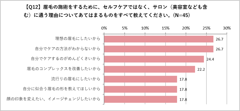 眉毛に関する施術を受けにサロンに通う理由を質問したところ、1位から3位までが僅差で、「自分でケアの方法がわからないから」と「理想の眉毛にしたいから」が26.7%で最も多く、次いで「自分でケアするのがめんどくさいから」(24.2%)、「眉毛のコンプレックスを改善したいから」(22.2%)という結果となりました。自分の理想の眉になりたいという希望と、自分でケアする手間暇やコンプレックスを解消する目的でサロンに通っていることが伺えます。