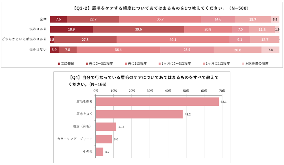 また、「自分で行っている眉毛のケア」についても質問したところ、最も多かったのは「剃る」(68.1%)、次いで「抜く」(48.2%)、「眉活(育毛)」(11.4%)が多くの票を集めました。その他については全て「カット」という回答でした。