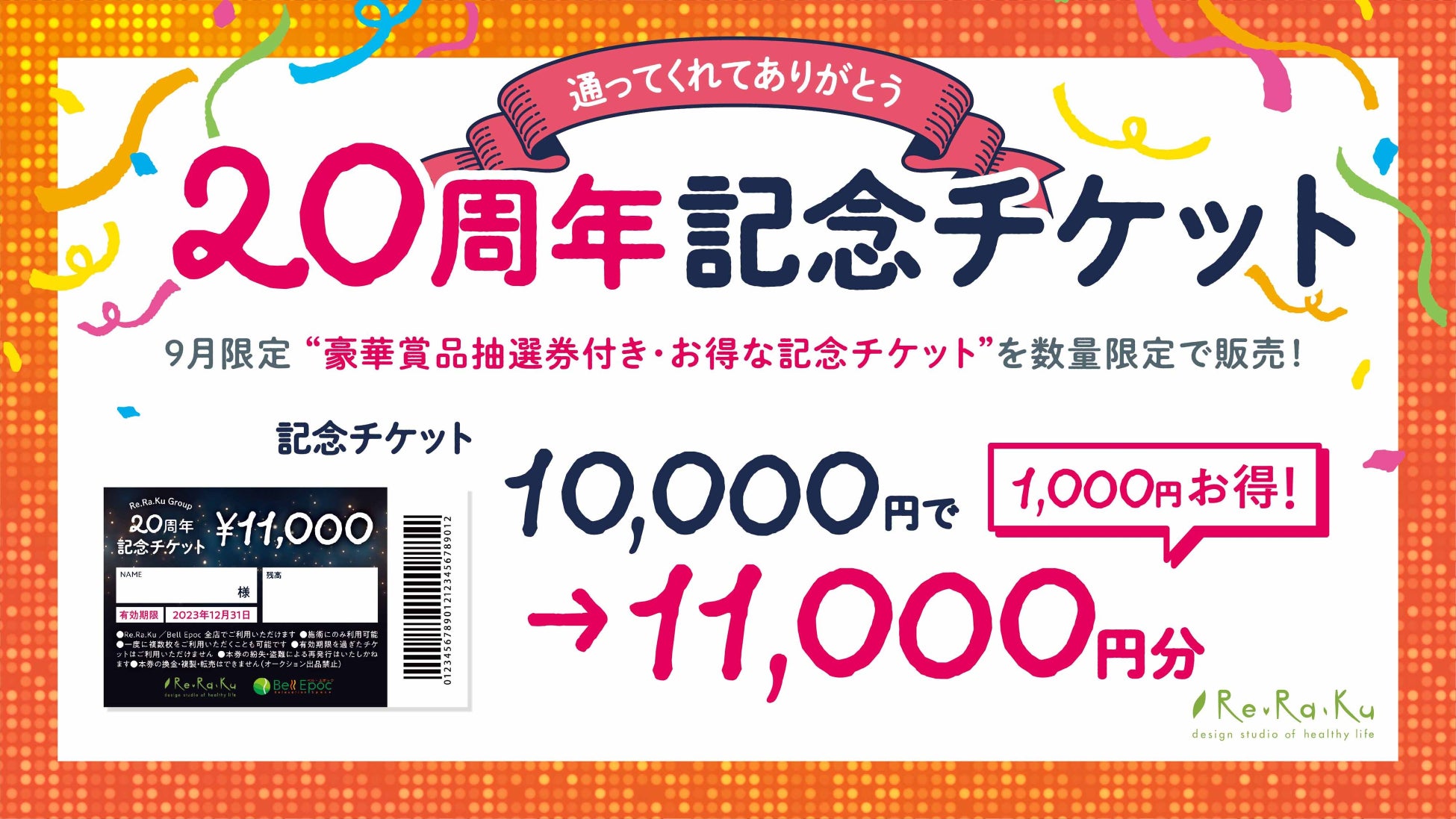 Re.Ra.Ku Bell Epoc でお得にご利用いただける抽選番号付きの20周年記念チケットを期間限定で販売いたします。