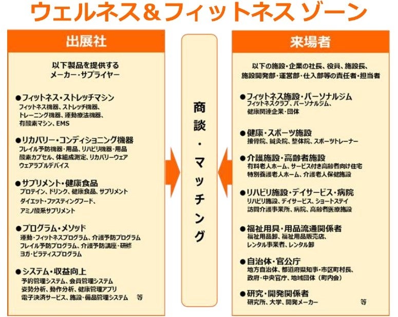 新たに【ウェルネス&フィットネス ゾーン】を新設し、健康寿命の延伸に役立つ商品やサービスを提供する企業と、シニア層への健康促進に取り組むフィットネスクラブや介護事業者・自治体・これら商品を取り扱う流通関係者による活発な商談・取引を行う場を提供する。フレイル予防や健康寿命の延伸をテーマとしたヘルスケアJAPAN東京は次回で7回目の開催となり、新ゾーン開設により更なる盛り上がりが期待される。