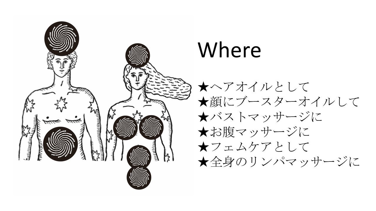 ピニアルオイルを少量手に取り、両手を擦り合わせてから、目、鼻、口に手が触れないように覆います。鼻でゆっくり香りをかいで息を吸い、細く長く息を吐き、ゆっくり深呼吸します。お風呂上がりのボディケアやフェムケアに。寝る前のお腹のマッサージに。洗顔後のブースターオイルやヘアオイルとしてもご使用いただけます。