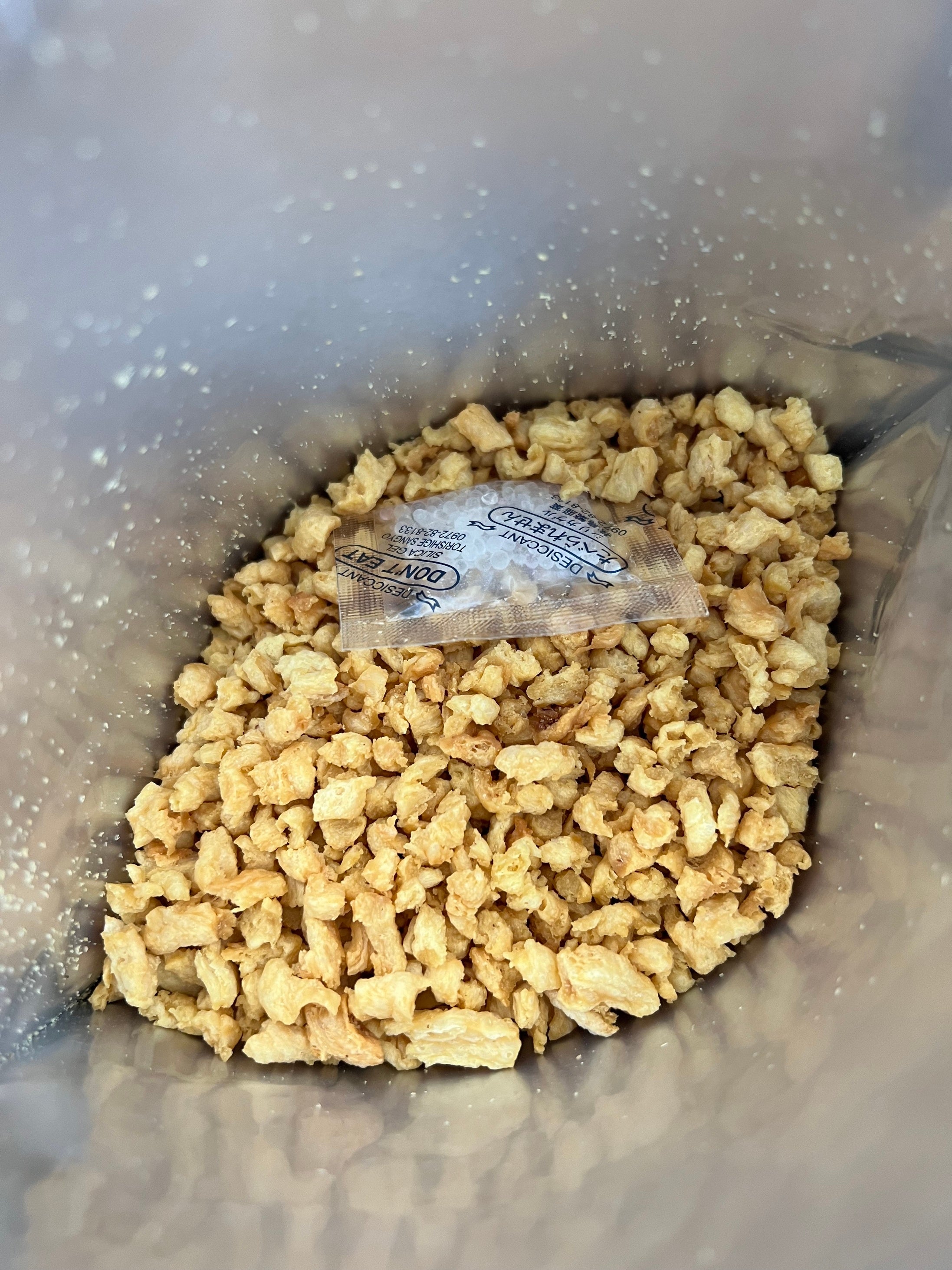 100gの中にたんぱく質が37.6g含有されています。そのままでも食べられますが、お湯の場合は98℃で10分間浸すと3.4倍に(30gの大豆ミートが湯戻しで約100g)、水の場合は常温水に10分浸すと約2.45倍(約40gの大豆ミートが水戻しで約100g)にすることができます。