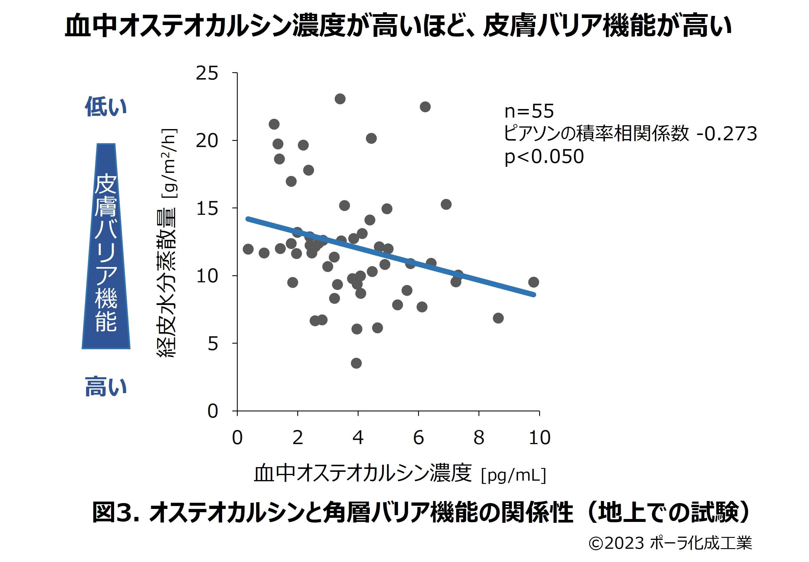 オステオカルシンの血中濃度が高いほど、経皮水分蒸散量が低い、つまり皮膚バリア機能が高いことが示唆されました (図3)。