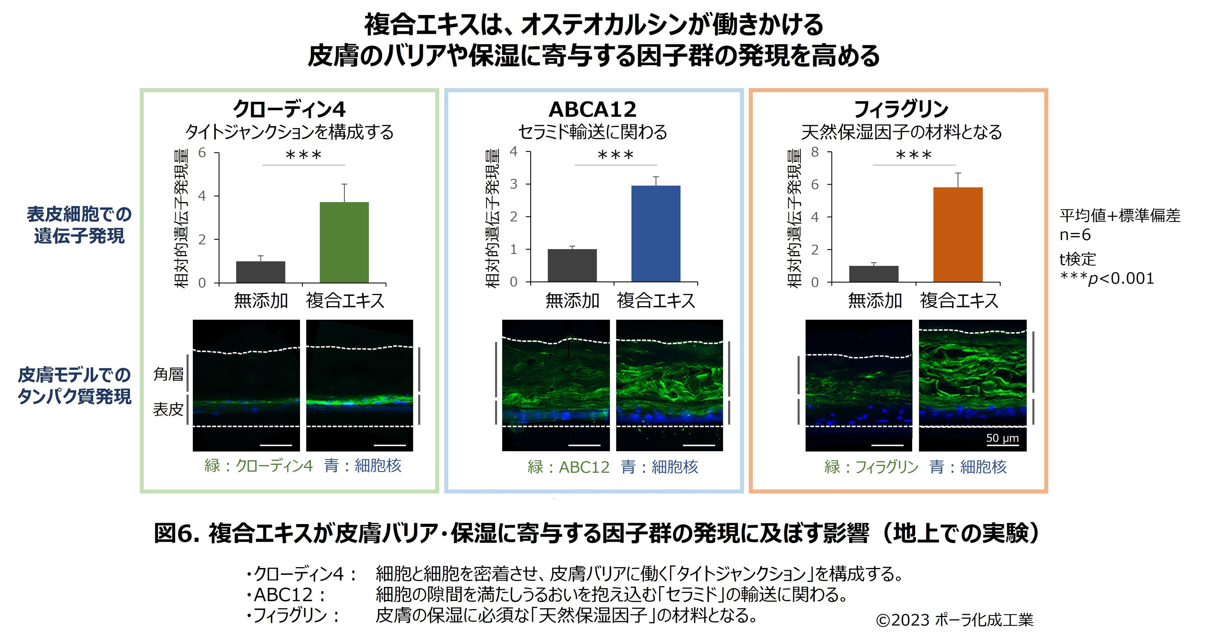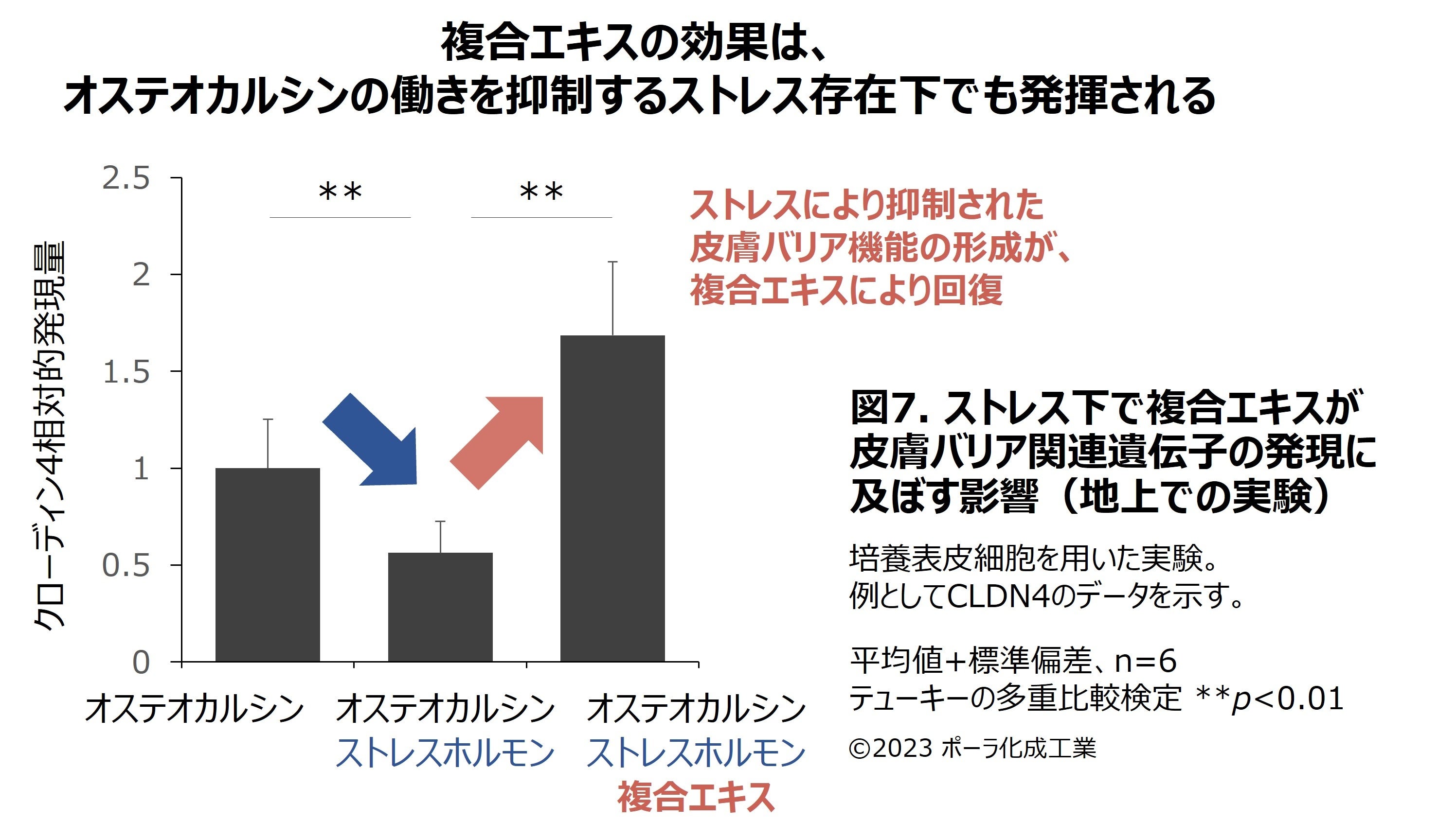 表皮細胞に、オステオカルシン、ストレスホルモンであるコルチゾール、および複合エキスを添加し検証したところ、複合エキスは、ストレスホルモン存在下においてもバリア機能関連遺伝子群の発現を高めることが明らかになりました (図7)。