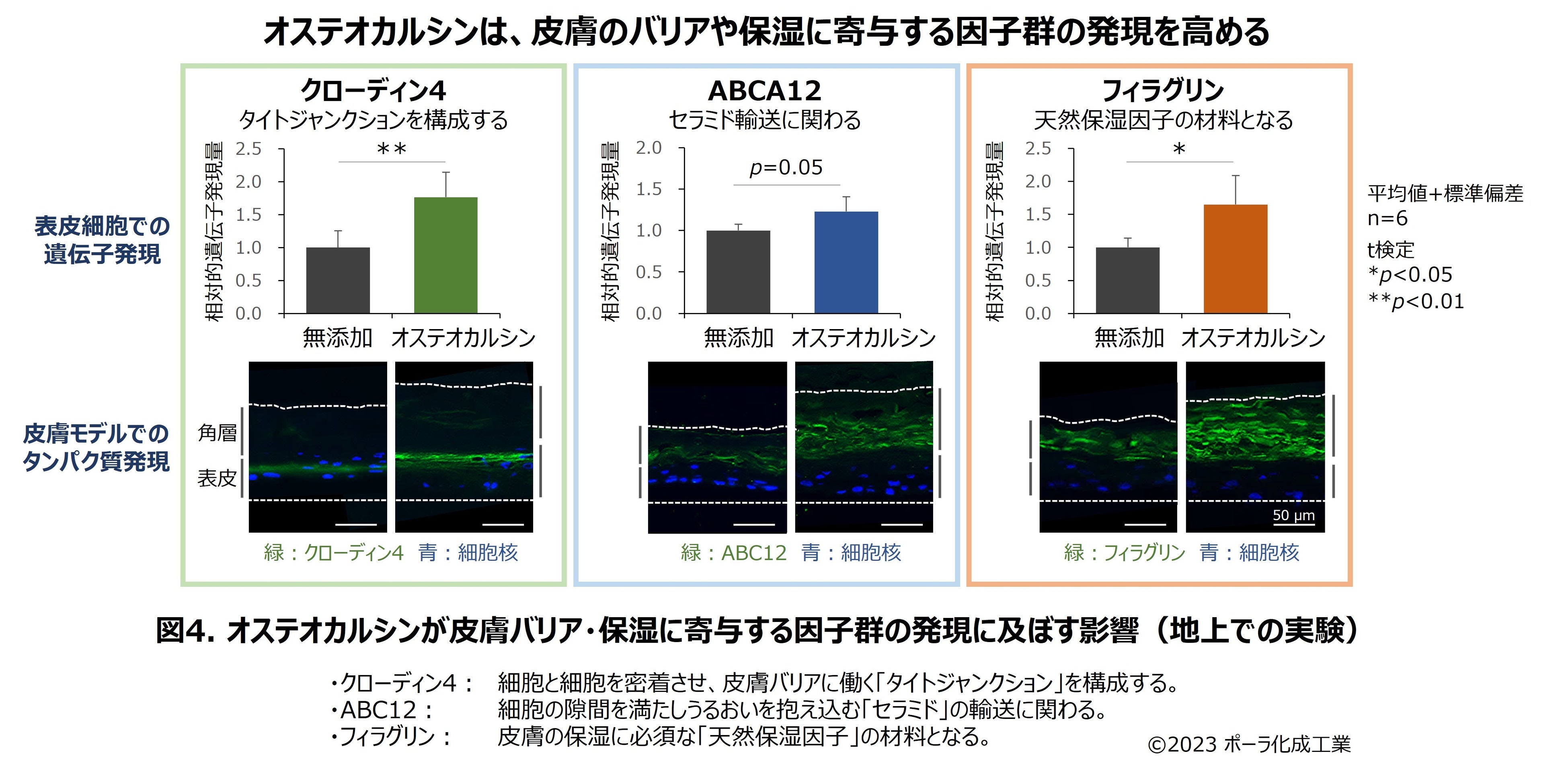 オステオカルシンを表皮細胞あるいは三次元皮膚モデルに添加すると、各因子の発現が増加しました(図4)。つまりオステオカルシンは、バリア機能や保湿に寄与する因子群の発現を高めることで、角層機能を総合的に高めることが明らかになりました。