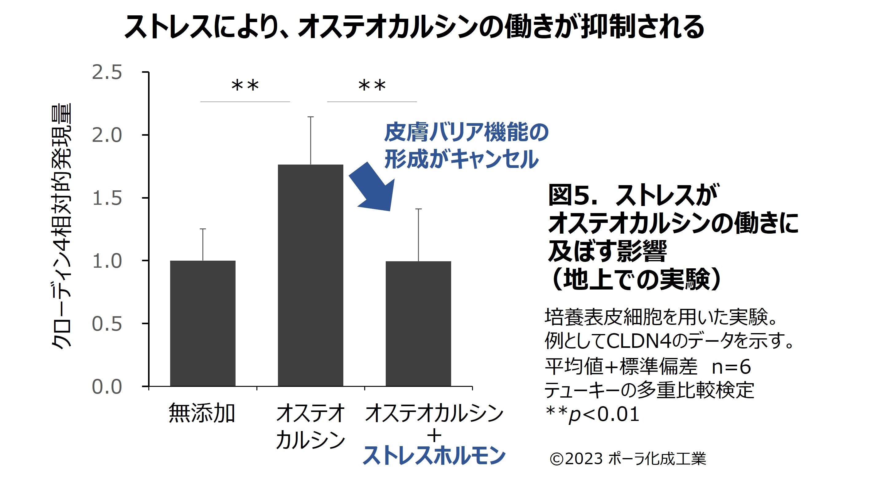 この結果は、ストレスがかかると、オステオカルシンによるバリア機能の促進効果が弱まってしまう可能性を示しています。