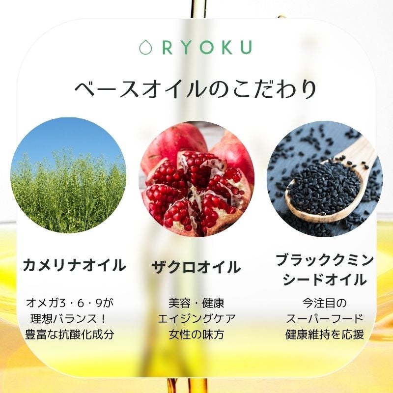 『RYOKU』の「CBD OIL」は、純度99%のCBDを使用した、CBD濃度10%のオイルです。ベースとなる油脂は、低温圧搾法(コールドプレス製法)を使用した、有機JAS認証カメリナオイル、ザクロオイル、ブラッククミンシードオイルをオリジナルブレンドしています。各原料の良さを生かしつつ、厳選された原料を使用し丁寧な製法で作られています。更にビタミンDとテルペン配合し、ふんわりとしたフルーティーの香りから、サラッとした飲みやすい味わいとなっています。