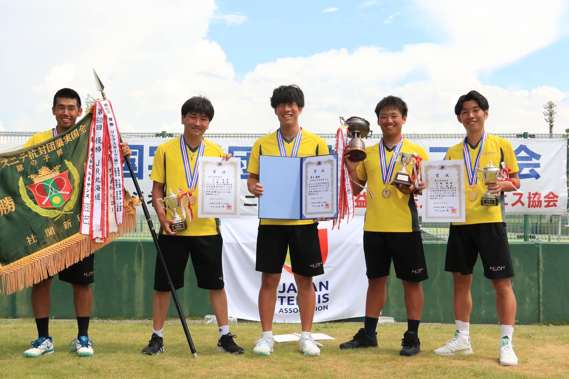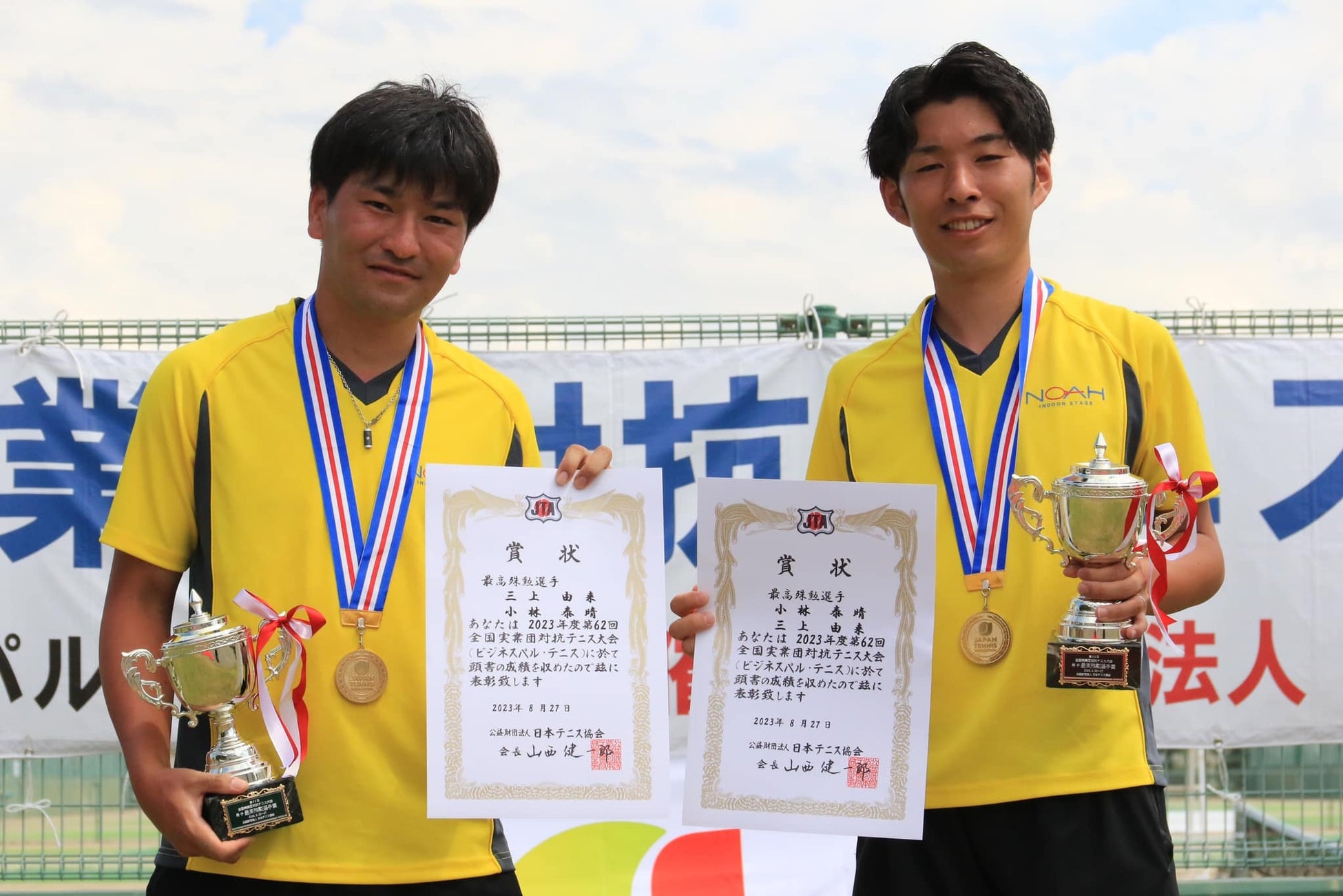 前回大会が準優勝、今大会で実業団を創部してから念願の全国大会初の優勝。参加選手は普段テニススクール・ノアでコーチとして活躍。小林泰晴コーチと三上由来コーチが大会の「最高殊勲選手」の個人表彰を受賞しました。
