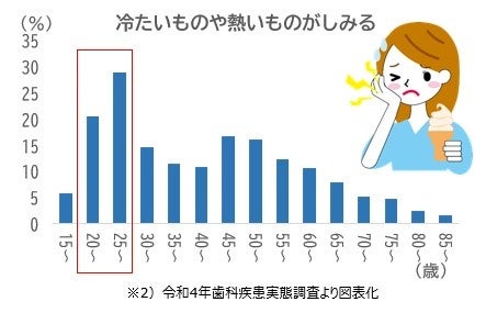 歯がシミる症状は中高年に多いイメージですが、実は20代が最も多いというデータがあります。20代~50代を対象にしたアンケート調査※1によると65%が「歯がしみる」体験をしており、なかでも、「歯や口の状態について気になること」で「冷たいものや熱いものがしみる」と答えたのは20代が最も多いという結果※2でした。