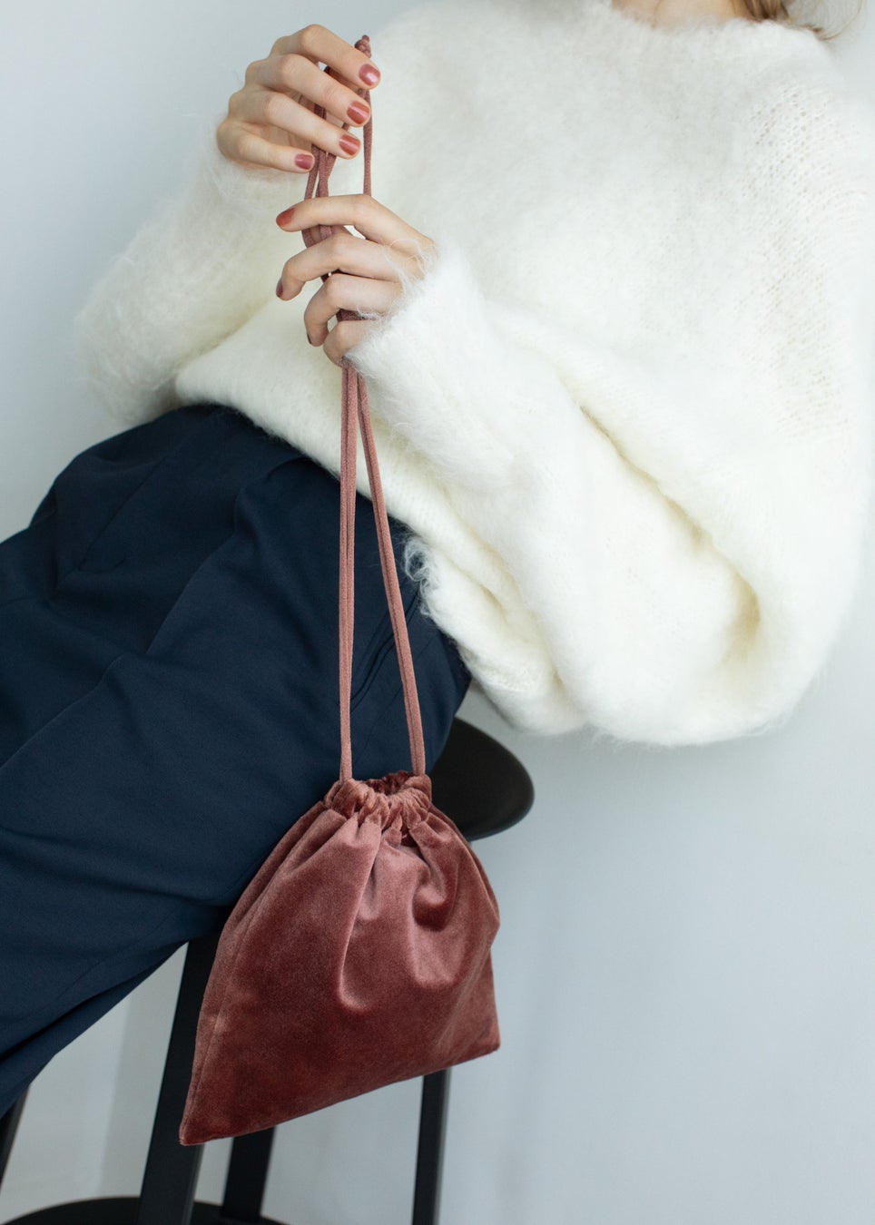 手触りの良い柔らかなドレープが特徴のベロア生地を使用。繊細で滑らかな光沢感を出すことで、高級感のある質感に仕上げました。また、紐にヒートカット加工を施すことでより使いやすい仕様にアップデート。アイシャドウパレット「rihka feelings palette」を持ち運びやすいように、内側にポケットも付いています。
