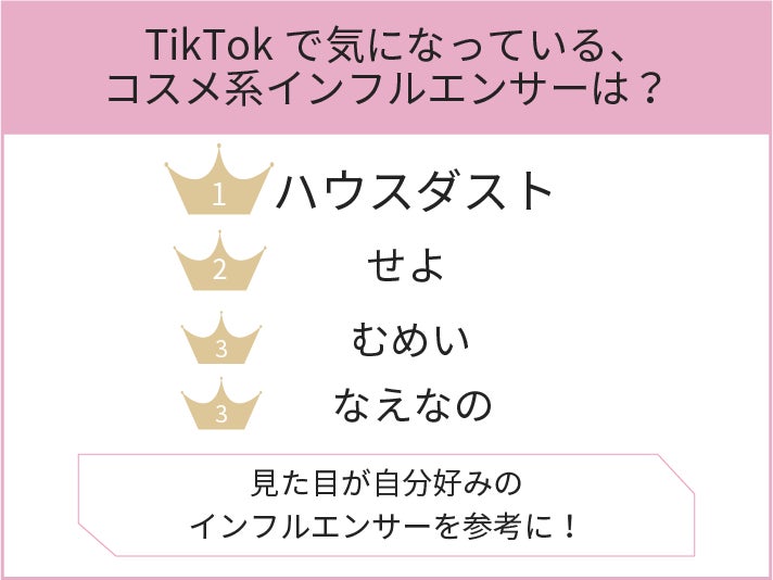 Z世代がTikTokでコスメ情報を収集する際、参考にするコスメ系インフルエンサーとして最も人気が高かったのは、100万人以上のフォロワーを抱える「ハウスダスト」さんでした。高いメイク技術と、プチプラコスメを上手く使いこなしている点が人気のようです。2番目に人気が高かったのは、韓国風メイクのレクチャー動画をわかりやすく発信している「せよ」さんでした。