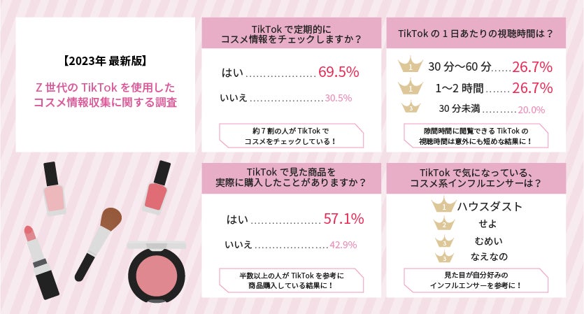 【2023年最新 Z世代のコスメ事情調査レポート】Z世代の69.5%がTikTokでコスメ情報を収集!57.1%がコスメの「TikTok買い」を経験