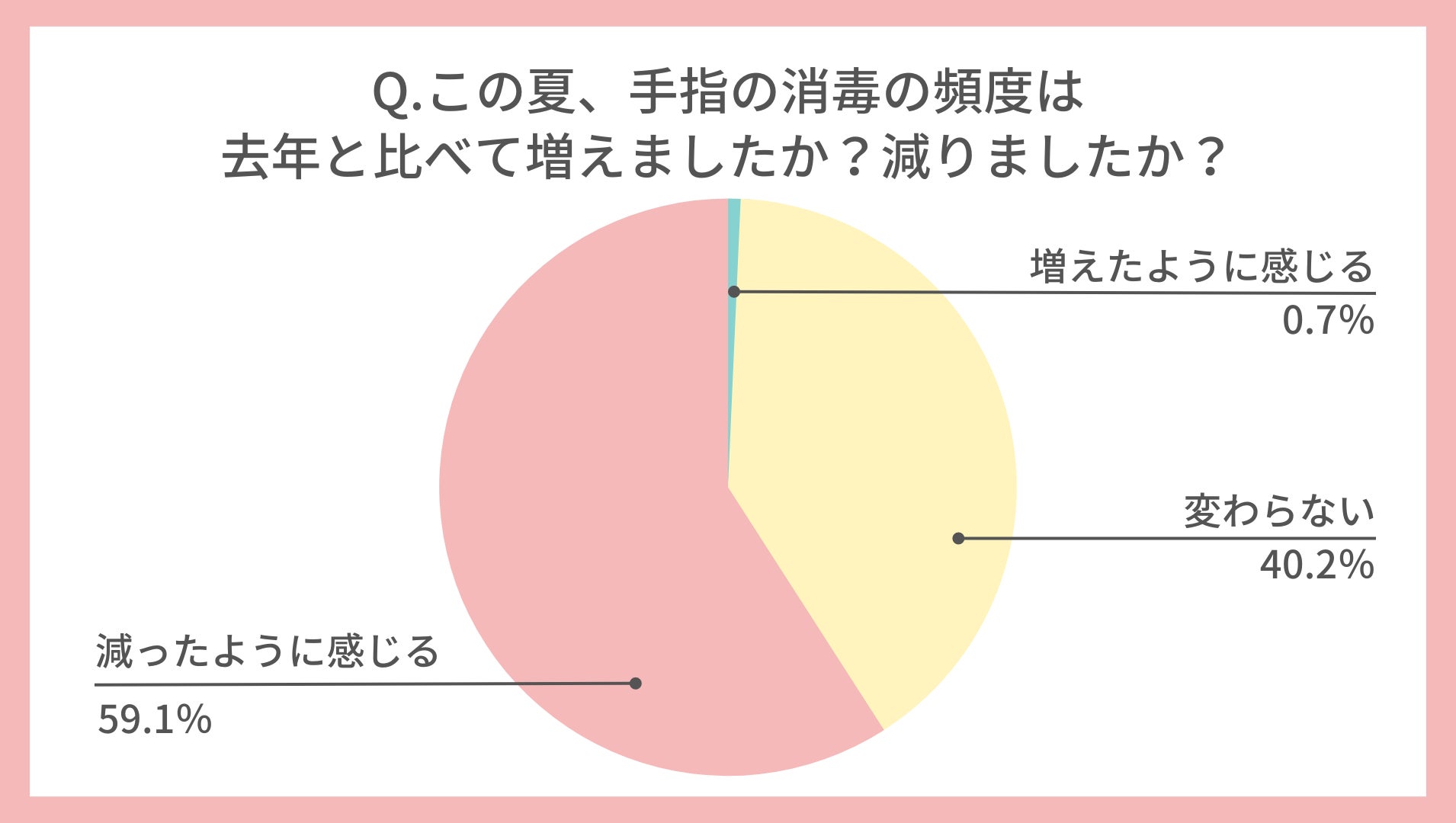 「この夏、手指の消毒の頻度は去年と比べて増えましたか?減りましたか?」と尋ねたところ、「減ったように感じる」と答えた女性は59.1%でした。