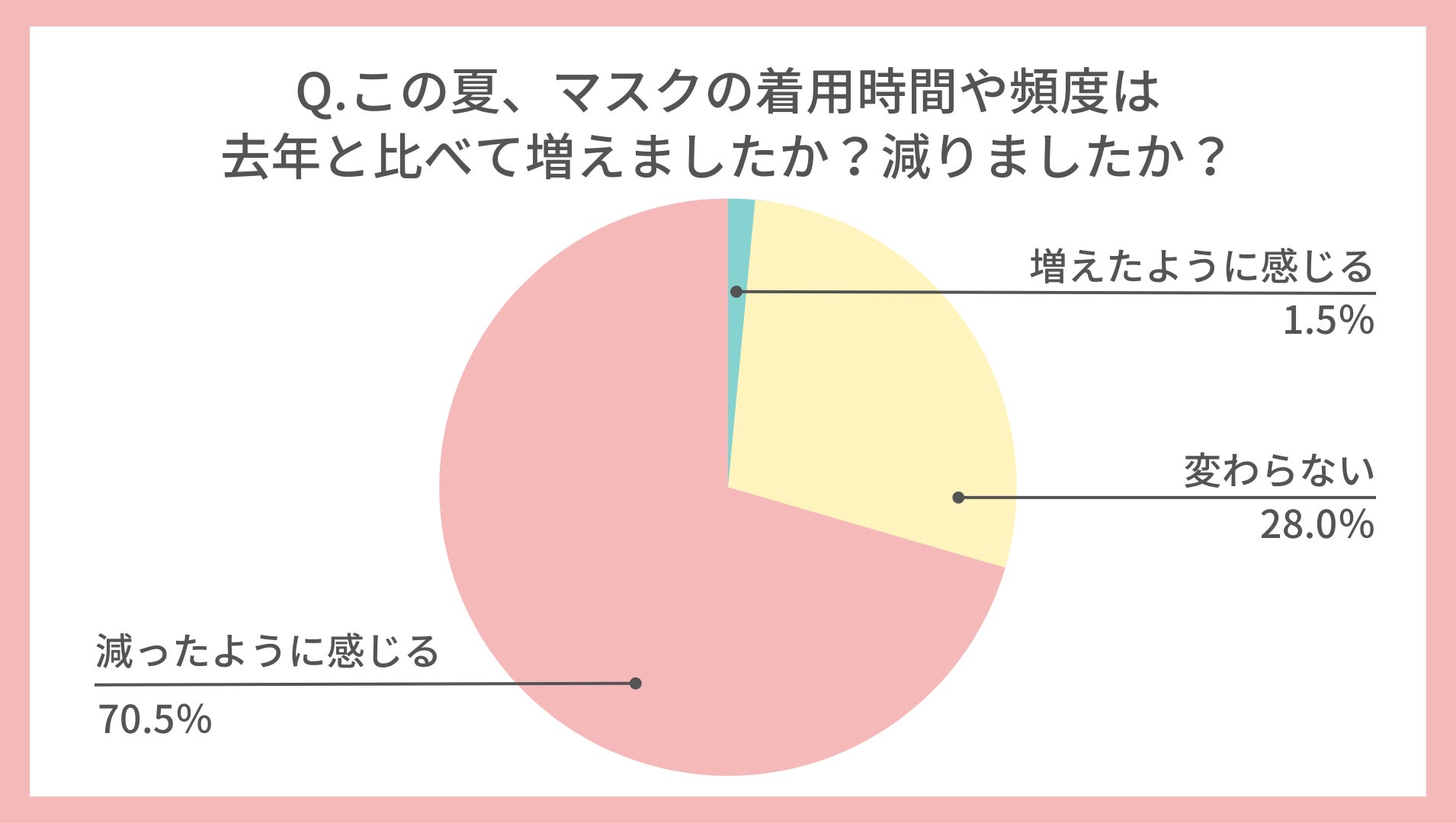 そこで今回、20〜40代の女性286名にアンケートを実施。「この夏、マスクの着用時間や頻度は去年と比べて増えましたか?減りましたか?」と尋ねたところ、「減ったように感じる」と答えた方は70.5%に上りました。