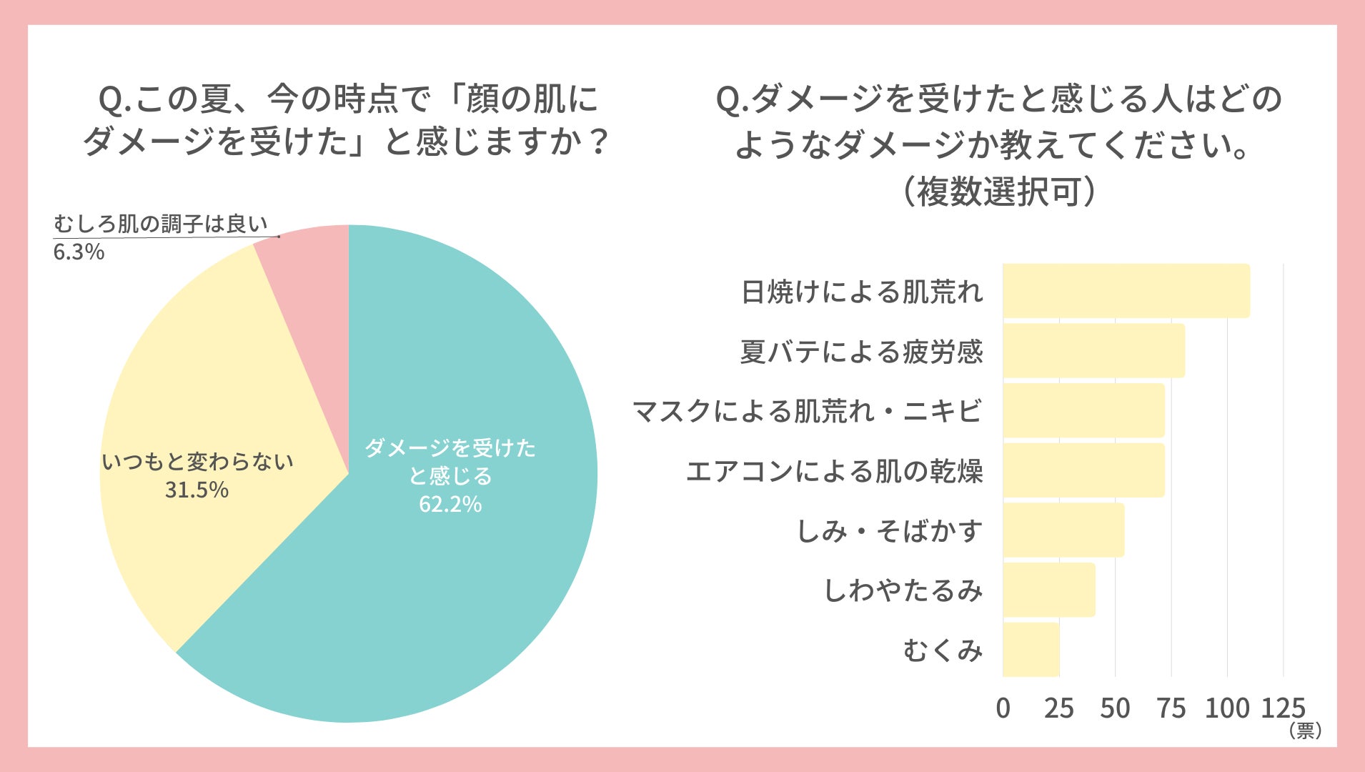 アンケートの回答から、アフターコロナの夏、調査時点で顔のダメージを受けたと感じている女性は半数以上に上りました。特に多くの女性が体感しているのは、日焼けによるダメージです。