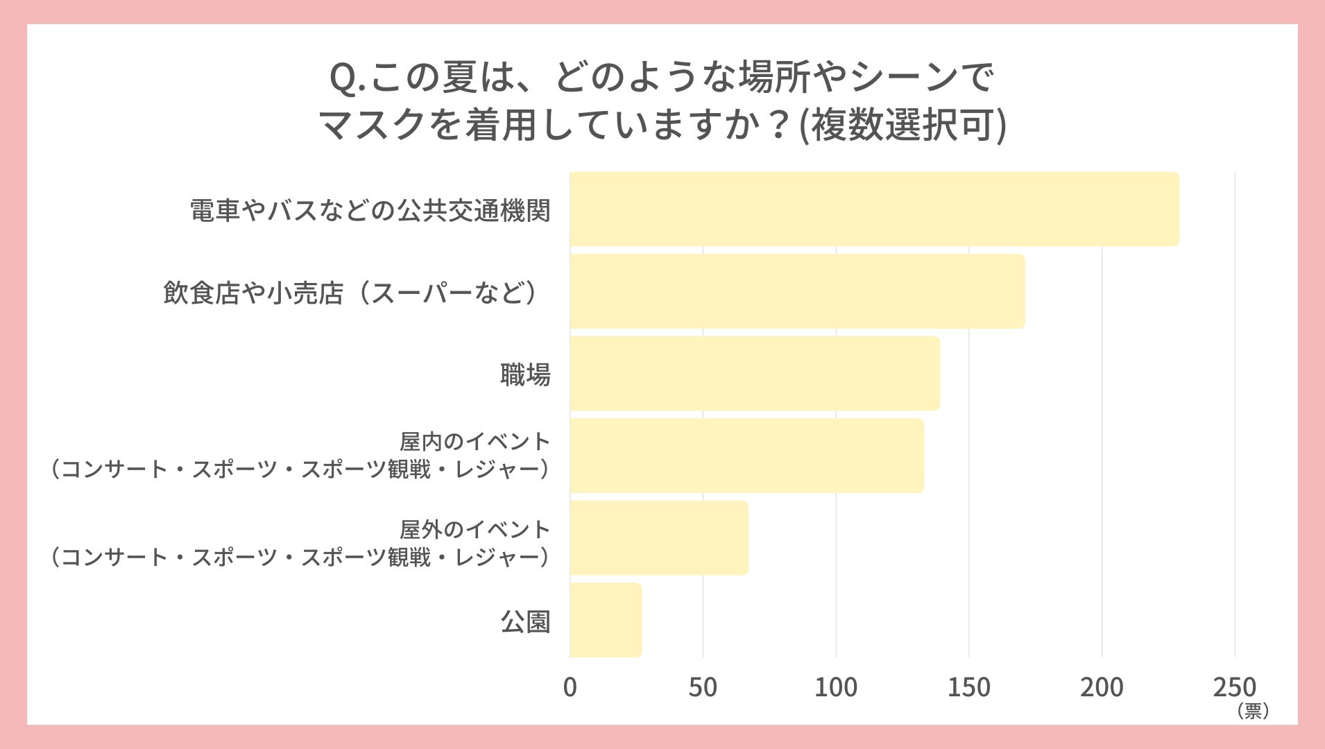続いてどのような場所・シーンでマスクを着用するかを尋ねたところ、もっとも多かったのは「電車やバスなどの公共交通機関」(229票)。それから「飲食店や小売店(スーパーなど)」(171票)、「職場」(139票)と続きました。また、屋内のイベント(コンサート・スポーツ・スポーツ観戦・レジャー)は133票でした。