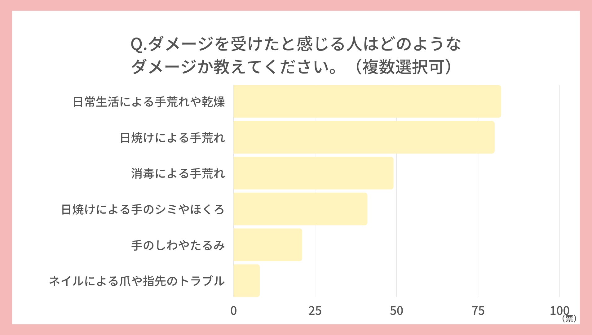 「日焼けによる手荒れ」(80票)、「日焼けによる手のシミやほくろ」(41票)も要因として上がっており、顔へのダメージと同じく、強い日差しが手指へ影響していると分かります。