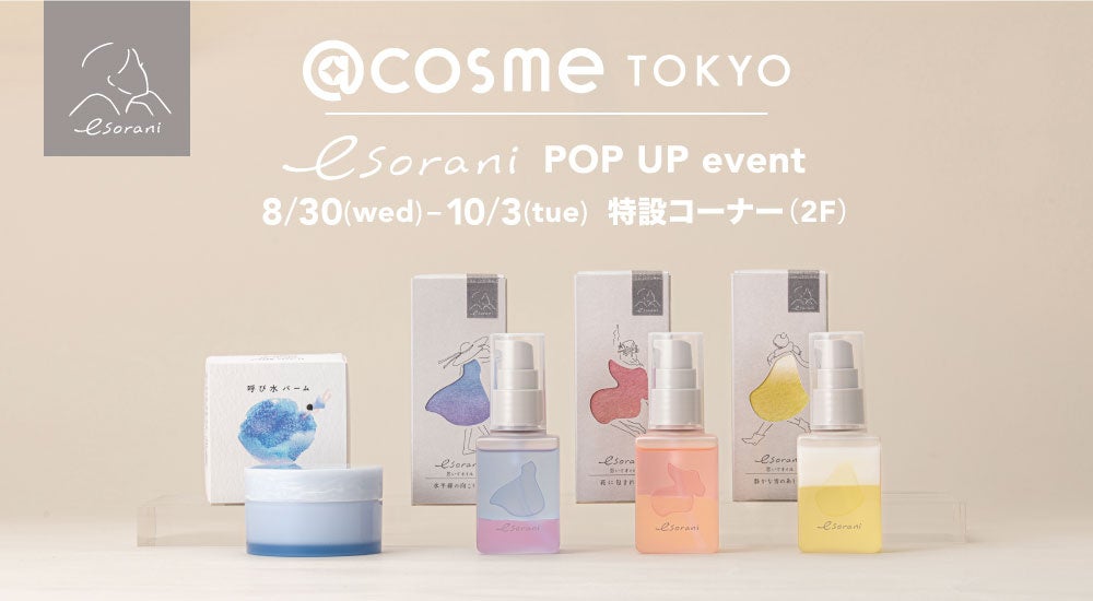 「esorani」は、日本の四季や景色・伝統などから新しい着想を得ながら、“心と肌に心地よい”をテーマに作られたコスメブランドです。通常はオンラインでしか買えない「esorani」のフルラインアップを、たくさんの方にお試しいただきたく、@cosme TOKYO 2階に特設コーナーを設置いたします。この機会にぜひ、香りや質感、肌触りやパッケージなどのこだわりが詰まった商品をご体感ください。