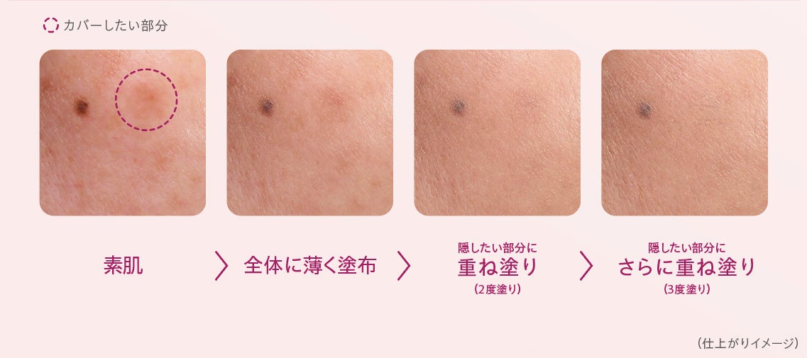 ■1品で簡単にカバー感を調整でき、重ねても厚塗り感がなく、肌にピタッと均一に密着します。