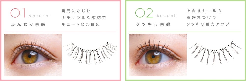 「ナチュラル」と「アクセント」の2種類のデザインで、メイクや気分に合わせて好みの束感まつげをお選びいただけます。