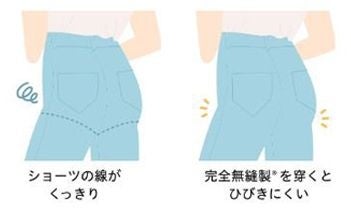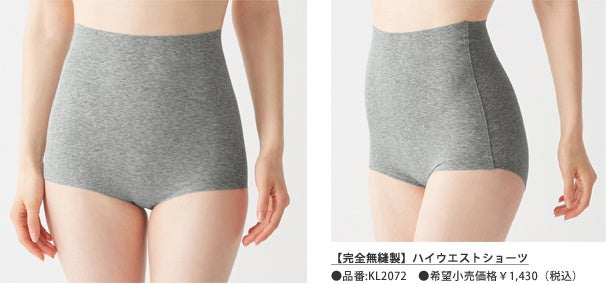 「KIREILABO」の完全無縫製ショーツは、ウエストや裾まわりにゴムを一切使用せず、生地と生地を縫わずに仕上げた縫い目がないショーツです。縫い目による刺激を軽減した肌へのやさしさにこだわった商品で、まるではいて いないようなストレスフリーのはき心地を多くのお客さまに支持いただいています。その人気ロングセラー商品から新たに登場する「ハイウエストショーツ」は、寒い季節だけではなく年間を通じて「おなかを温めたい」というニーズにお応えし、従来品よりもはき込みを8㎝深くした設計で、おなかをすっぽり包み込みます。クーラーによる冷えや朝晩の寒暖差対策にもおすすめです。
