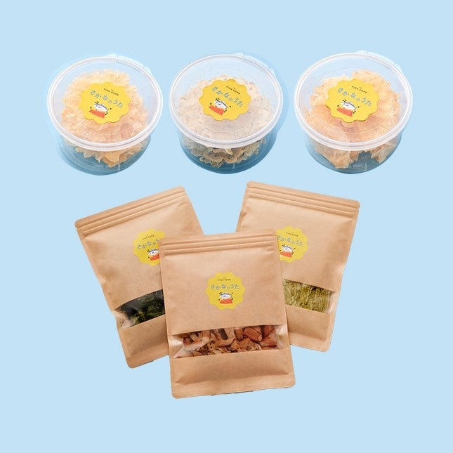 「さかなのうた」は海産乾物を原料に使用した“健康海鮮おやつ”です。成長過程にある子どもはもちろんのこと、日々の栄養不足で栄養価の高いおやつを提供し、かつ、衰退しつつある乾物業界を活性化させることを目的に商品を開発しました。