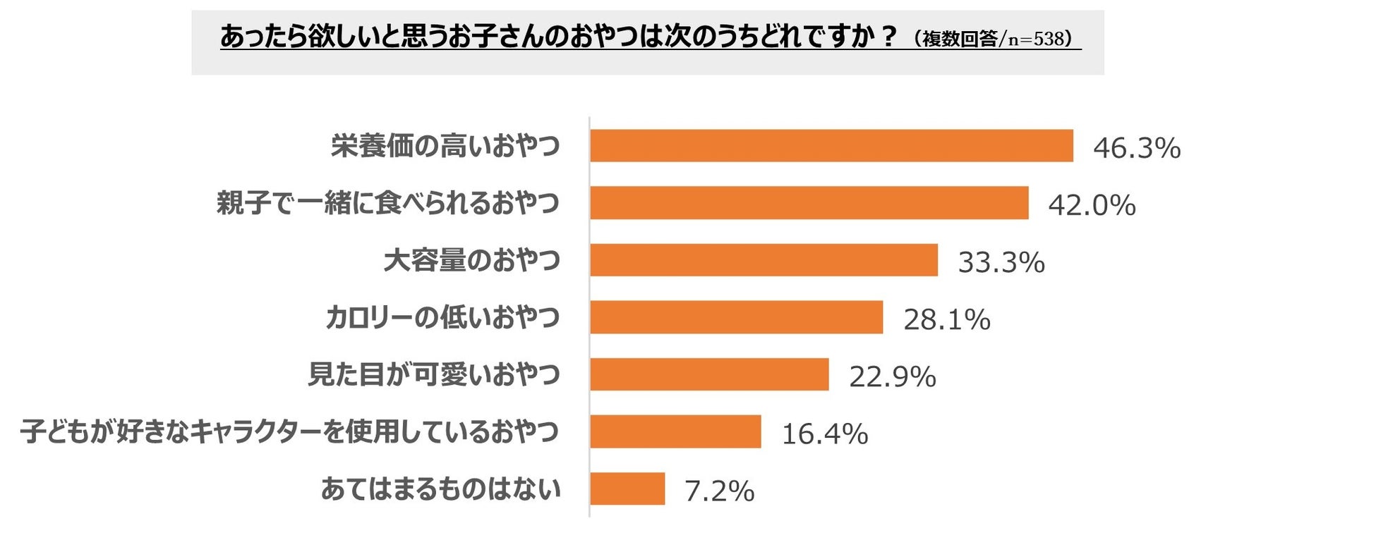 3.「あったら欲しいと思うおやつ」を尋ねたところ、1位「栄養価の高いおやつ」(46.3%)、2位「親子で一緒に食べられるおやつ」(42.0%)、次いで3位「大容量のおやつ」(33.3%)と回答しました。お子さまの栄養を考え、栄養価の高いおやつや親子で一緒に食べられるおやつをパパ・ママが望んでいることが分かりました。