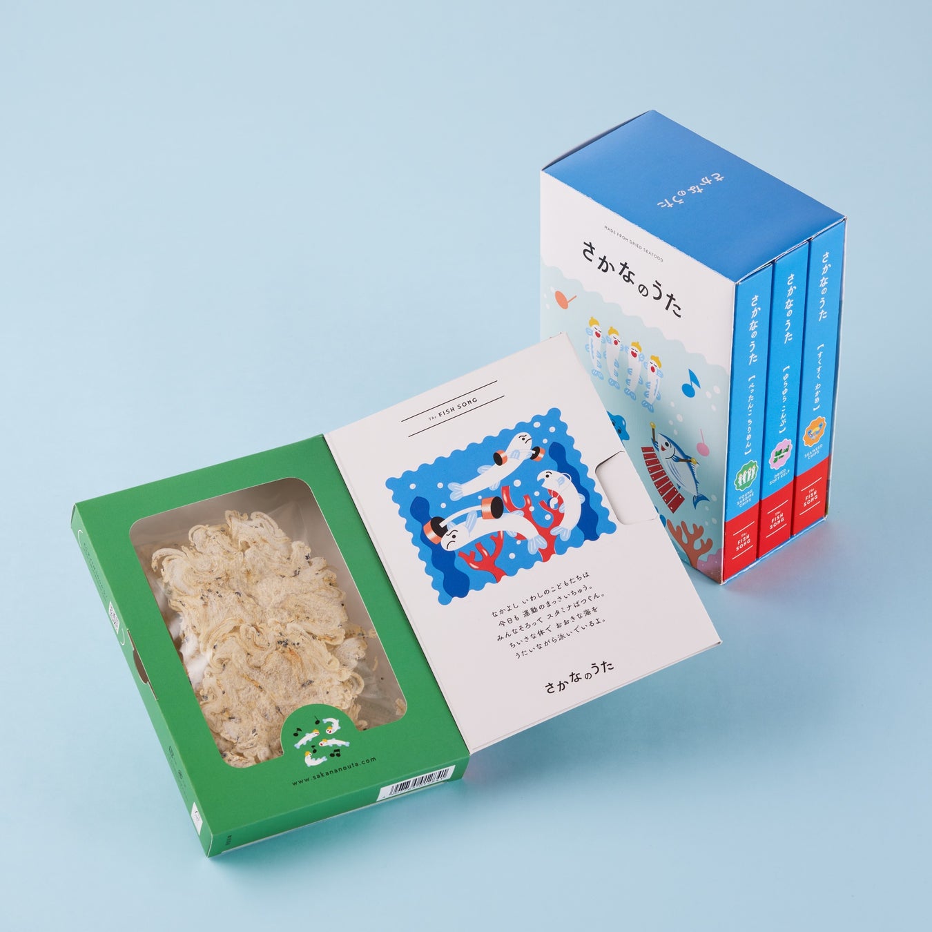「さかなのうた」の個性豊かな全6アイテムを専用カバーにセットしたコンプリートBOX。それぞれの食べ比べや、カラフルでかわいい仲間たちの絵本をお楽しみください!