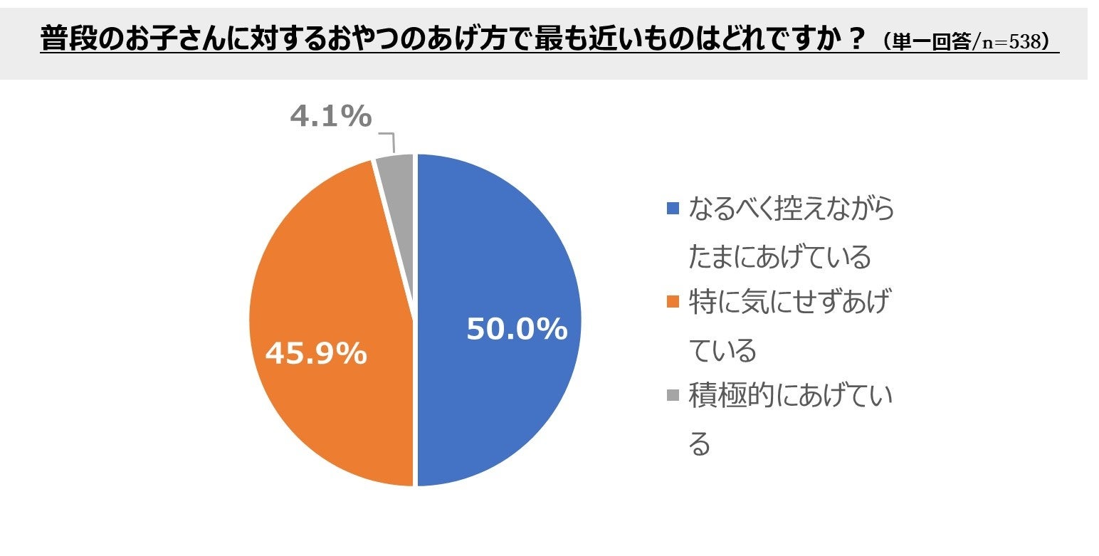 普段お子さんへのおやつのあげ方として、「特に気にせずあげている」(45.9%)、「なるべく控えながらたまにあげている」(50.0%)と結果が半数に分かれた。